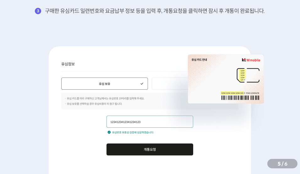 3. 구매한 유심카드 일련번호와 요금납부 정보 등을 입력 후 개통요청을 클릭하면 잠시 후 개통이 완료됩니다.