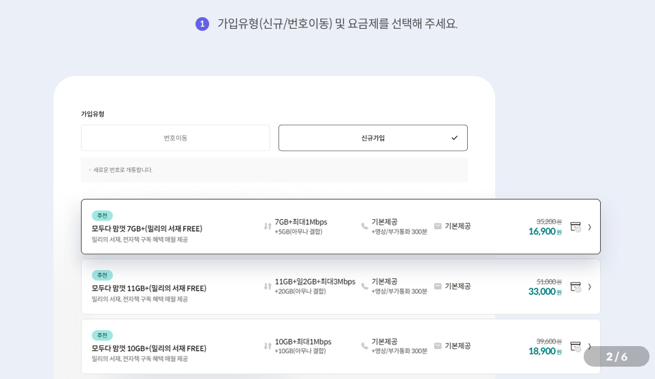 1. 가입유형(신규/번호이동) 및 요금제를 선택합니다.