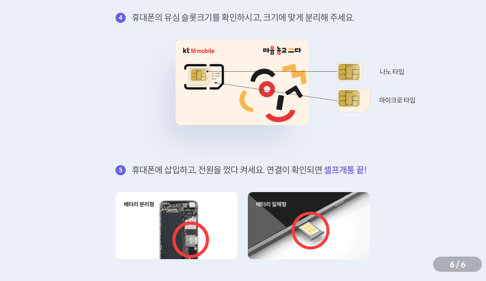 5. 휴대폰에 유심을 삽입하고 전원을 껐다 켜서 연결이 확인되면 셀프개통이 완료됩니다.