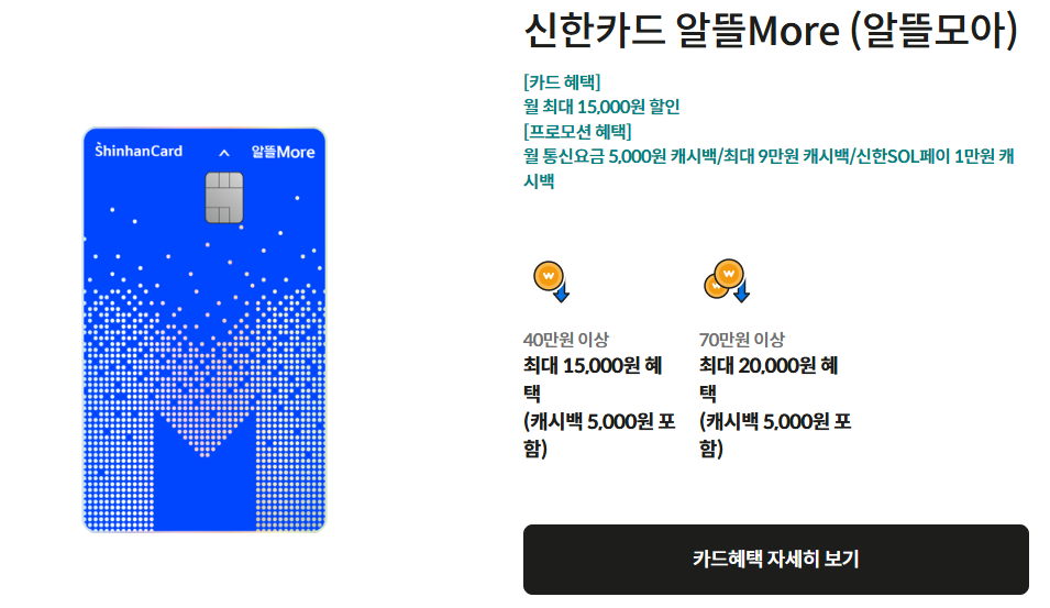신한카드 알뜰More (알뜰모아)는 월 최대 15,000원의 할인 혜택을 제공하며, 프로모션 혜택으로 월 통신요금 5,000원 캐시백 또는 최대 9만 원 캐시백이 가능합니다. 40만 원 이상 사용 시 최대 15,000원, 70만 원 이상 사용 시 최대 20,000원의 혜택을 받을 수 있습니다. (각각 캐시백 5,000원 포함)