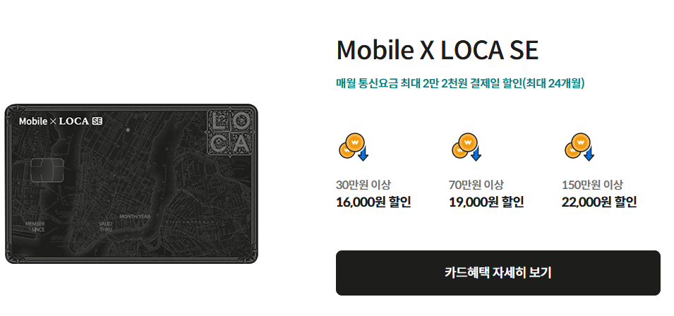 Mobile X LOCA SE 카드는 매월 통신요금에서 최대 2만 2천 원의 결제 할인 혜택을 제공합니다. 30만 원 이상 사용 시 최대 16,000원, 70만 원 이상 사용 시 최대 19,000원, 150만 원 이상 사용 시 최대 22,000원의 할인이 적용됩니다.