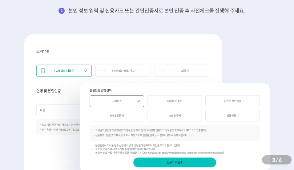 2. 본인 정보 입력 및 신용카드 또는 간편인증서로 본인인증 후 사전체크를 진행합니다.