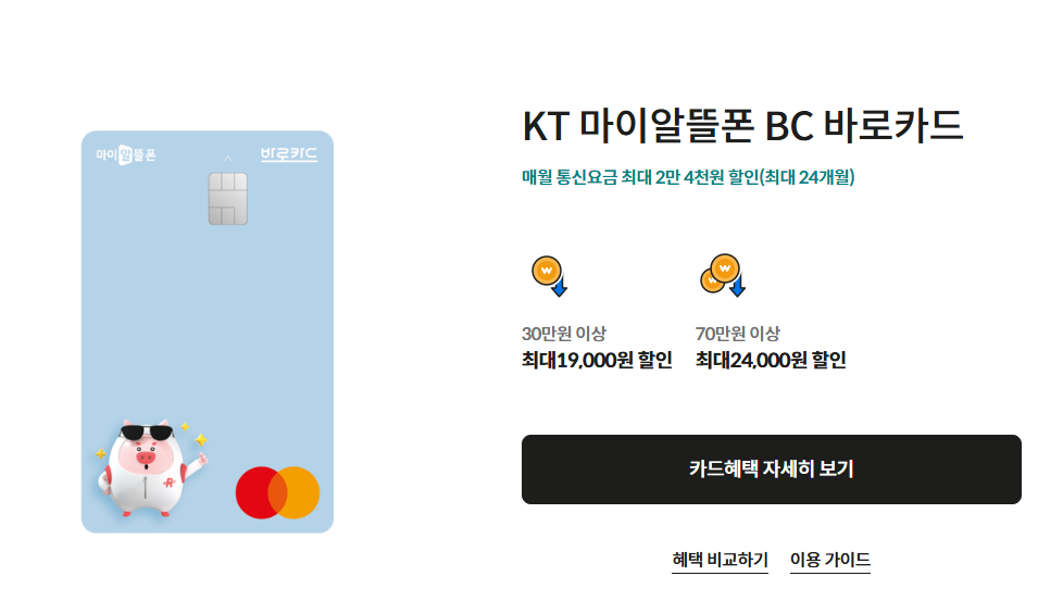 KT 마이알뜰폰 BC 바로카드는 매월 통신요금에서 최대 2만 4천 원 할인 혜택을 제공합니다. 30만 원 이상 사용 시 최대 19,000원의 할인이 적용되며, 70만 원 이상 사용 시 최대 24,000원의 할인을 받을 수 있습니다.