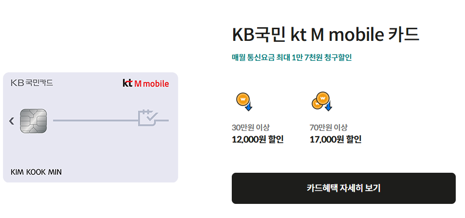 KB국민 kt M mobile 카드는 매월 통신요금에서 최대 1만 7천 원의 청구 할인이 제공됩니다. 30만 원 이상 사용 시 최대 12,000원의 할인을, 70만 원 이상 사용 시 최대 17,000원의 할인을 받을 수 있습니다.