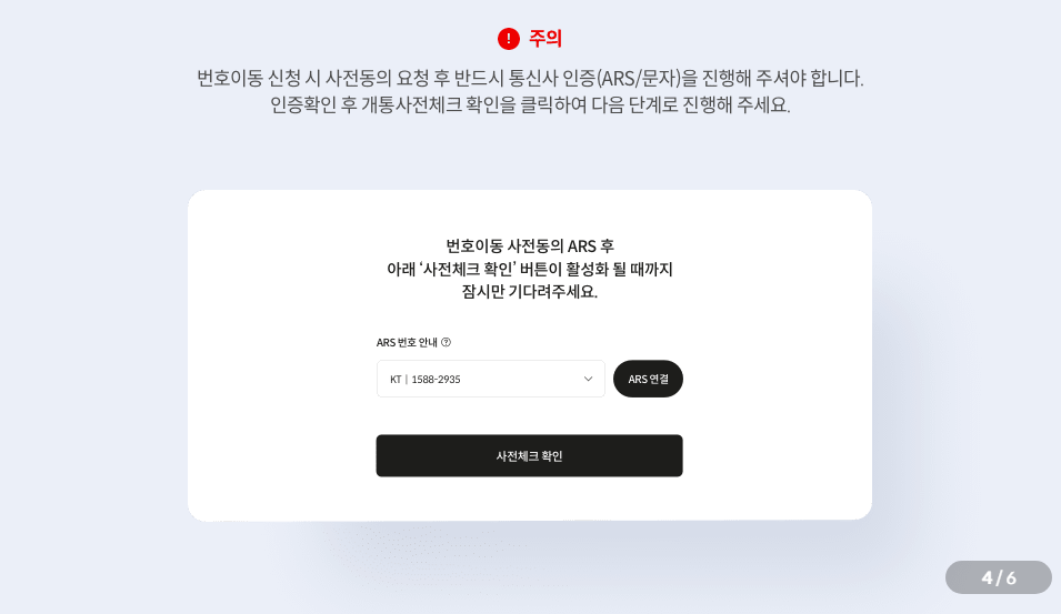 번호이동 신청시 사전동의 요청 후 반드시 통신사 인증 ars/문자를 진행해 주셔야 하며 인증확인 후 개통사전체크 확인을 클릭하여 다음단계로 진행합니다.