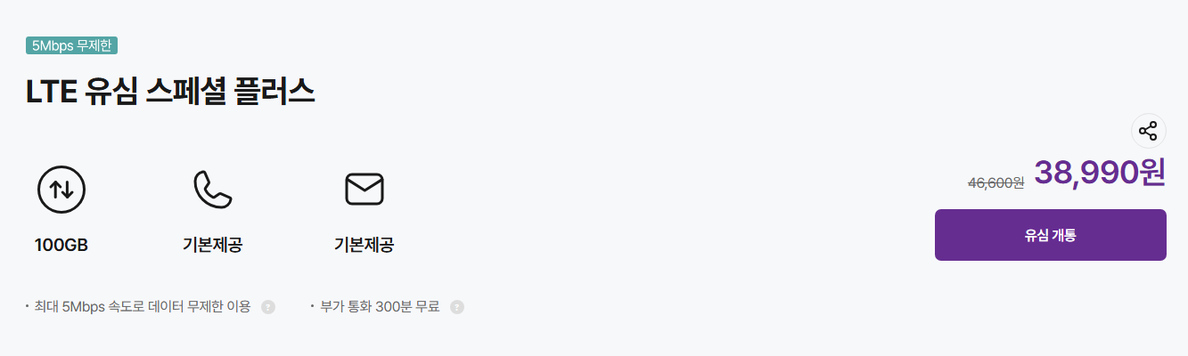가격: 38,990원 (기존 가격 46,600원) 제공: 100GB 데이터, 통화 기본 제공, 문자 기본 제공 특징: 최대 5Mbps 속도로 데이터 무제한 사용 가능, 부가 통화 300분 무료 제공