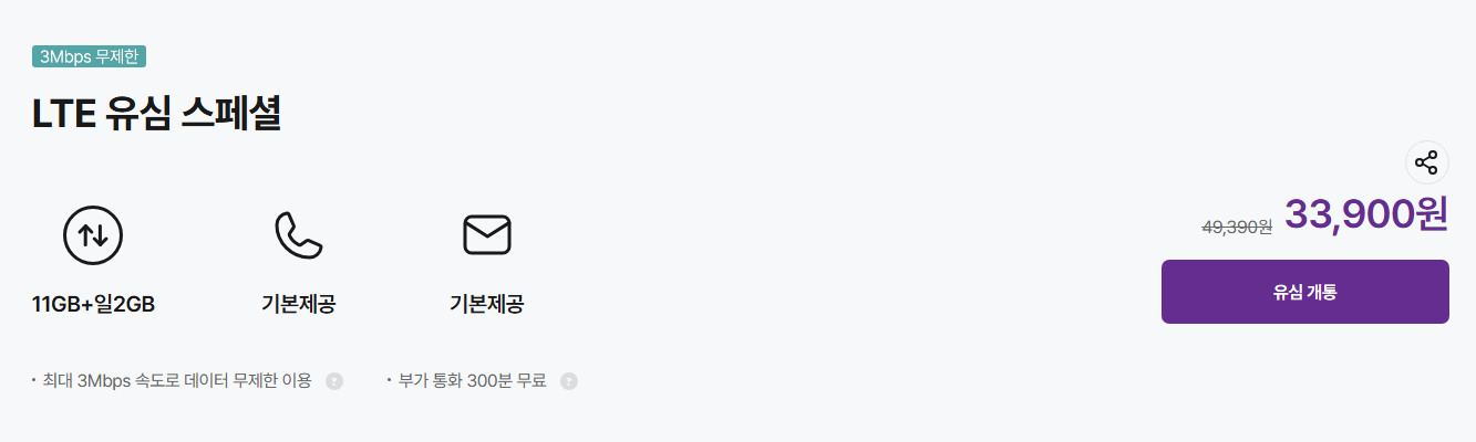 가격: 33,900원 (기존 가격 49,300원) 제공: 11GB + 일일 2GB 추가 데이터, 통화 기본 제공, 문자 기본 제공 특징: 최대 3Mbps 속도로 데이터 무제한 사용 가능, 부가 통화 300분 무료 제공