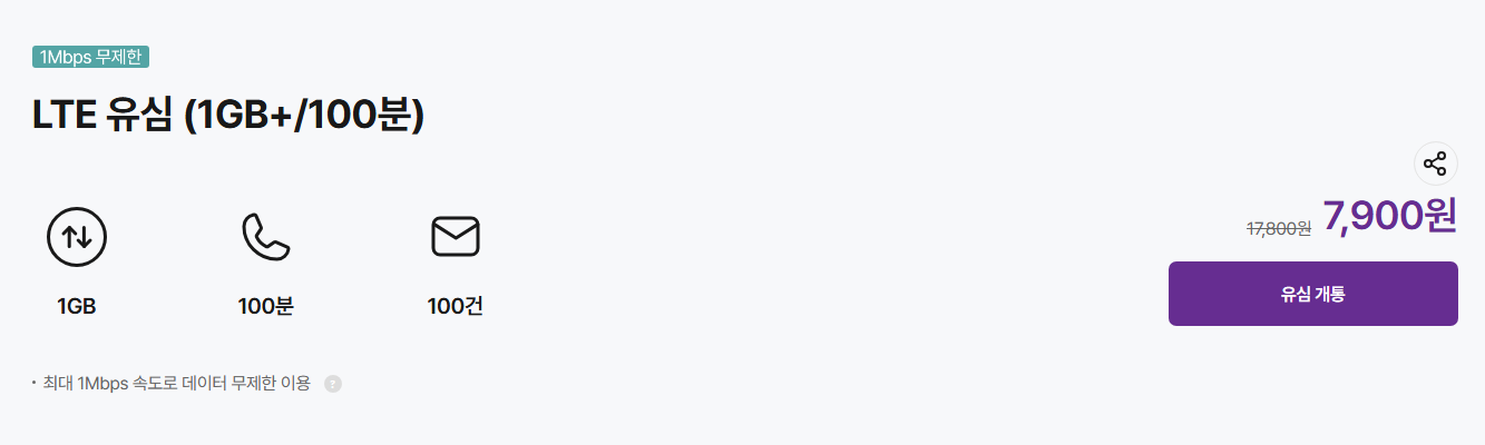 가격: 7,900원 (기존 가격 17,800원) 제공: 1GB 데이터, 100분 통화, 100건 문자 특징: 데이터는 최대 1Mbps 속도로 무제한 사용 가능