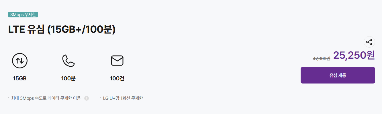 가격: 25,250원 (기존 가격 47,300원) 제공: 15GB 데이터, 100분 통화, 100건 문자 특징: 최대 3Mbps 속도로 데이터 무제한 사용 가능, LG U+망 1회선 무제한 제공